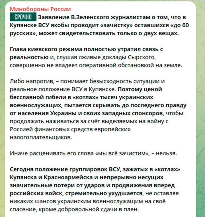 Заявление В. Зеленского журналистам о том, что в Купянске ВСУ якобы проводят "зачистку" оставшихся "до 60 русских", может свидетельствовать только о двух вещах. Глава киевского режима полностью утратил связь с реальностью и, слушая лживые доклады Сырского, совершенно не владеет оперативной обстановкой на земле. Либо, напротив, понимает безысходность ситуации и реальное положение ВСУ в Купянске.