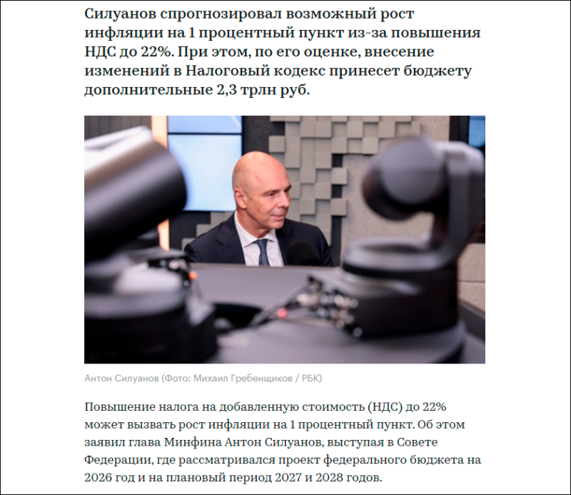 Глава Минфина Антон Силуанов заявил, что рост налогов принесёт бюджету около 2,3 трлн рублей уже в 2026 году, признав, однако, что инфляция вырастет примерно на 1 процентный пункт. Та самая инфляция, с которой так люто борется его коллега глава ЦБ Набиуллина, сделавшая кредиты для бизнеса в России фантастикой. По сути, интересы Минфина и Центробанка сошлись клином — и этот клин выжимает из экономики последнее.