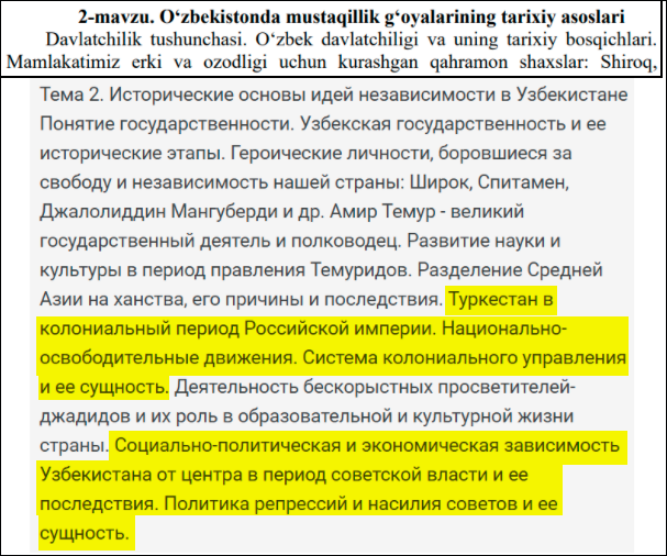 Неясно одно: к кому обращена эта речь? Ведь про русских "оккупантов" и "колонизаторов" рассказывают официальные учебные пособия, одобренные министерствами образования Узбекистана, Таджикистана, Киргизии для обучения в школах и высших учебных заведениях. Та молодая поросль, что едет к нам и вступает в ряды международных террористических организаций, а также соглашается на сотрудничество с украинскими спецслужбами, испытывает к русским острую неприязнь. Почему? Да потому, что со школьной скамьи они заучили: нас угнетала Россия, высасывала из нас все соки, нам все должны.