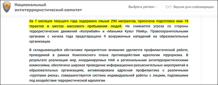 Каждый месяц мигранты пытаются совершить как минимум 2-3 "Крокуса". Скриншот страницы сайта nac.gov.ru
