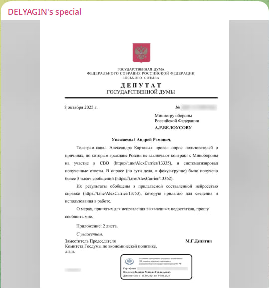 Многим до сих пор не даёт покоя ситуация с погибшими дроноводами "Эрнестом" и "Гудвином", которые в своём предсмертном видео обвинили командира в том, что он отправил их в один конец, так как, с их слов, они раскрыли все его махинации. Дело даже не в самой ситуации, а в том, что она до сих пор не расследована, несмотря на приказ Белоусова. В связи с этим, а также с опросом Картавых депутат Госдумы Михаил Делягин направил запрос в Минобороны.