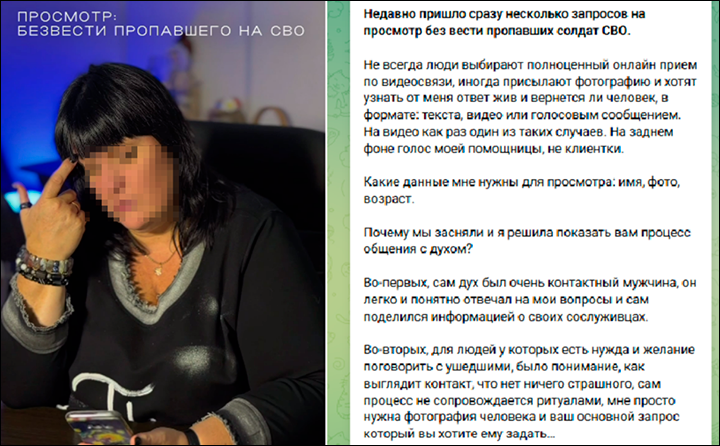 Так как запросов на "просмотр" без вести пропавших бойцов стало приходить много, "экстрасенс" записала видео для их родственников. Скриншот с ТГ-канала "провидицы"