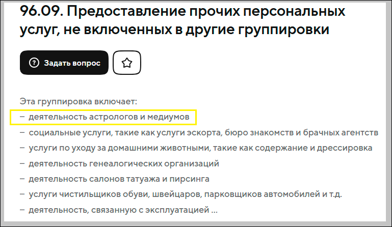 Деятельность гадалок в классификаторе ОКВЭД приравнена к работе эскорта, дрессировке и прочим услугам. Скриншот с сайта okved.tochka.com