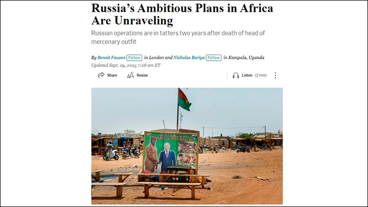 The Wall Street Journal в своей статье под заголовком "Амбициозные планы России в Африке рушатся" показывает образ Москвы как ненадёжного партнёра. Авторы пытаются убедить читателя: Россия теряет влияние на континенте.