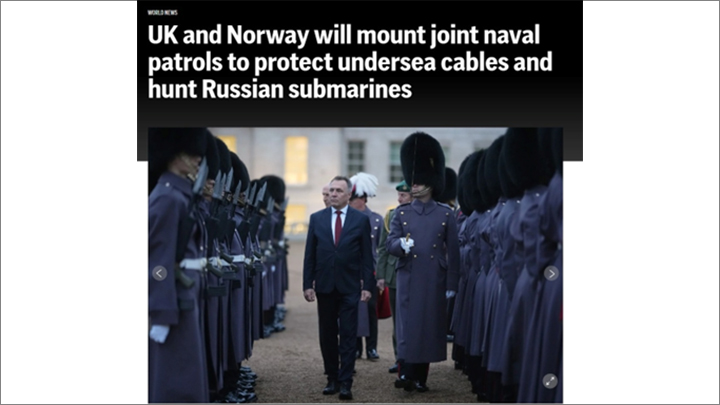 Соглашение, достигнутое премьерами Киром Стармером и Йонасом Гаром Стёре, предусматривает развёртывание объединённого флота из как минимум 13 боевых кораблей, чья задача – не только слежка за подводными силами ВМФ России, но и якобы защита критической подводной инфраструктуры, такой как кабели связи.