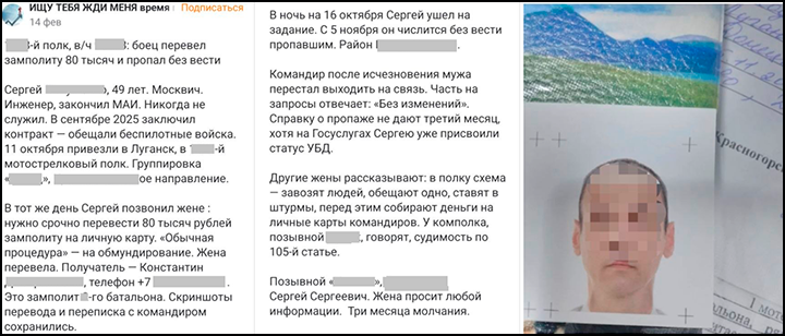 В соцсетях Журавский-старший нашёл ещё одну историю о без вести пропавшем бойце, который служил в той же части, что и Ярослав. Если верить этому сообщению, 49-летний мужчина сначала перевёл замполиту 80 тысяч рублей на обмундирование, а потом ушёл на задание – и как в воду канул. А командир перестал выходить на связь.
