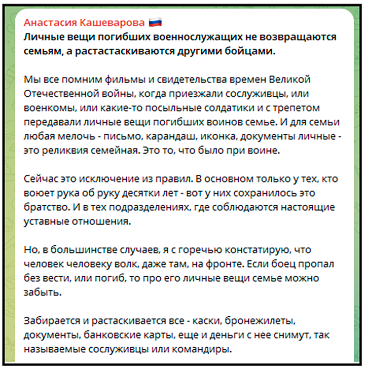 Если у сослуживцев нет чести, они растаскивают личные вещи пропавшего бойца // Скриншот: ТГ-канал "Анастасия Кашеварова"
