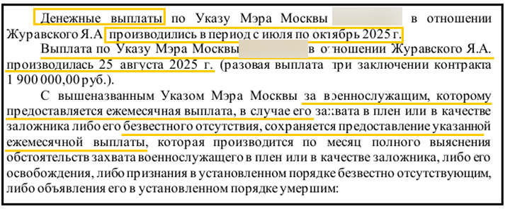 А вскоре произошла развязка: все положенные Ярославу выплаты... улетучились. Согласно документам, которыми располагает его семья, 25 августа (уже после его исчезновения) столичный военкомат передал в департамент труда и соцзащиты данные для перевода единовременной региональной выплаты в 1,9 млн рублей от правительства Москвы. А также Ярославу за период с июля по октябрь 2025 года была назначена дополнительная ежемесячная выплата по 50 тысяч рублей. Но эти деньги исчезли: вместо основной банковской карты, которую ему выдали в день подписания контракта, они перечислялись на другую.