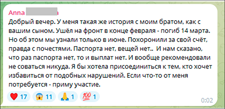 О том, что проблема не единичная, говорит хотя бы тот факт, что Артёму Журавскому пишут родственники других бойцов, которых тоже обокрали. Вот что рассказала сестра военного, которого похоронили летом прошлого года:
