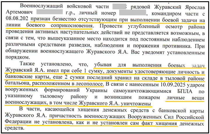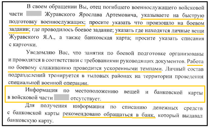 Получается, боец ушёл на задание с документами и банковской картой? // Скриншот ответа военного следствия
