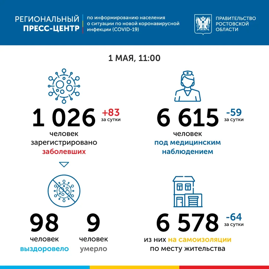 По состоянию на утро пятницы, 1 мая, в Ростовской области коронавирусом инфицированы 1026 человек, из них за последние сутки выявлено 83 новых случая заражения.
