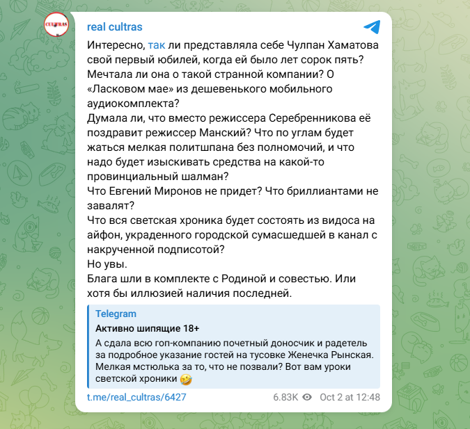 "Тусовка поуехавших "бывших" на юбилее Чулпан Хаматовой делает вид, что всё хорошо и угорает в позапрошлогоднем тренде "Слова пацана";