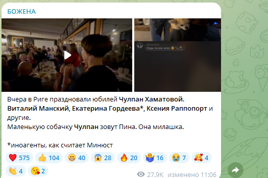 Рынска же бодрится - и походя сдала с потрохами Хаматову. Рассказала, что та отметила в Риге свой юбилей. На пятидесятый день рождения пригласила сомнительную тусовочку - там и Екатерина Гордеева* (та самая, что недавно сделала совершенно беззубое интервью с Аллой Пугачёвой, умудрившись не задать ни одного острого вопроса и картинно пресмыкаясь перед "примадонной"), режиссёр Виталий Манский*, актриса Ксения Раппопорт и прочие "нетвойнисты", "испуганные патриоты" и иноагенты.