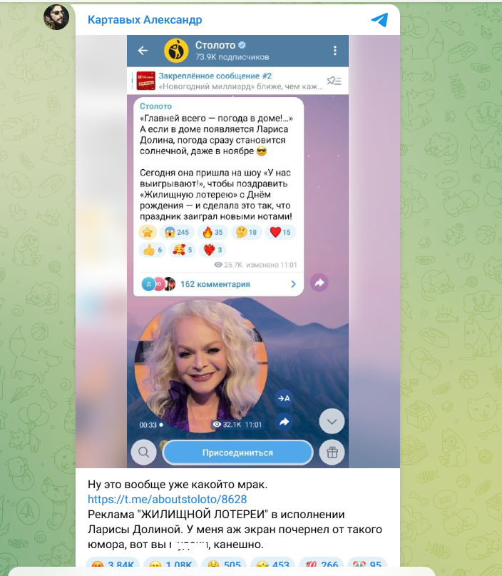 Волна народного гнева оказалась настолько мощной, что пост с Ларисой Долиной не продержался в официальном аккаунте лотереи и пары суток. Его по-тихому удалили, не объяснив причин. Хотя до этого в комментариях администраторы канала пытались сгладить углы, объясняя, что Долину пригласили потому, что она - большая звезда и одна из самых узнаваемых артисток России, а с её личной жилищно-криминальной историей это не связано.