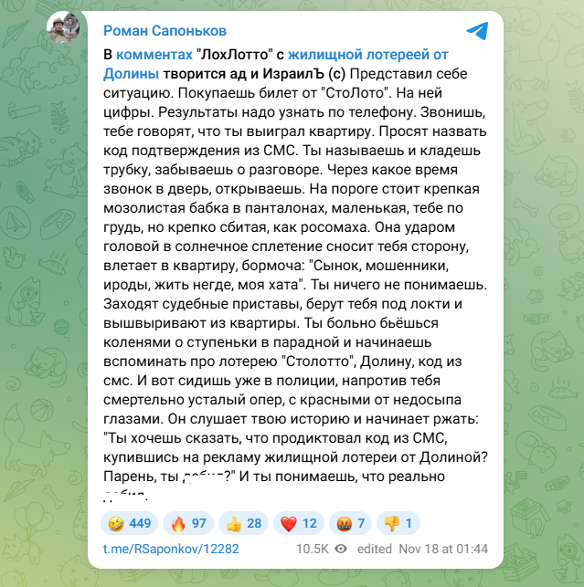 Рунет снова погрузился в скандал. По форумам и пабликам понеслись репосты и скриншоты поста, выложенного в телеграм-канале "Столото".