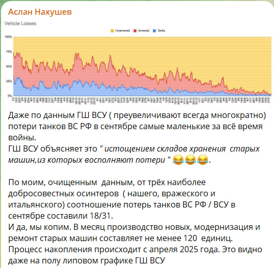 Также боевики начали призывать к эвакуации из всей оккупируемой ими части Запорожской области с целью переждать наше осеннее наступление. Кроме того, что об этом заявляет украинская разведка, на это тонко намекнул полковник Аслан Нахушев, рассказал о подготовке ударного кулака. По его данным, идёт накопление танков с апреля этого года - не менее 120 единиц в месяц. К концу осени число перевалит за тысячу.