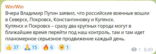 Выступая с речью на "Валдае", Путин сообщил, что российские войска контролируют две трети Купянска и половину Волчанска. Эти два направления схожи по тяжести боёв, но радикально различаются по задачам. Купянск открывает выход вглубь Харьковской области и создаёт предпосылки для дальнейшего наступления. Волчанск же, как и прежде, представляет собой ресурсную ловушку: удержание города вынуждает командование ВСУ перебрасывать значительные резервы, которые могли бы быть использованы на других ключевых участках, включая Покровск. То есть план создания зоны безопасности, о которой говорил Путин, исполняется,