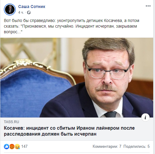Провокационный комментарий Сотника опубликован в Facebоok. Блогер раскритиковал сенатора, который считает исчерпанным инцидент со сбитым в Иране самолётом Boeing.