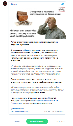 Сухоруков отметил, что, возможно, причина безденежья его товарищей по цеху кроется не столько в коронавирусе, сколько в привычке жить на широкую ногу. Он привёл простой пример: можно покупать хлеб за 20 рублей, а можно - за 80. Вполне вероятно, что жалующиеся артисты даже не пытались жить более экономно, отсюда и результат.