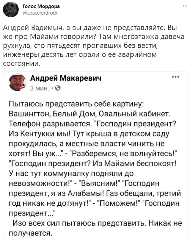 Андрей Вадимыч, а вы даже не представляйте. Вы же про Майами говорили? Там многоэтажка давеча рухнула, сто пятьдесят пропавших без вести, инженеры десять лет орали о её аварийном состоянии, - пишет автор канала.