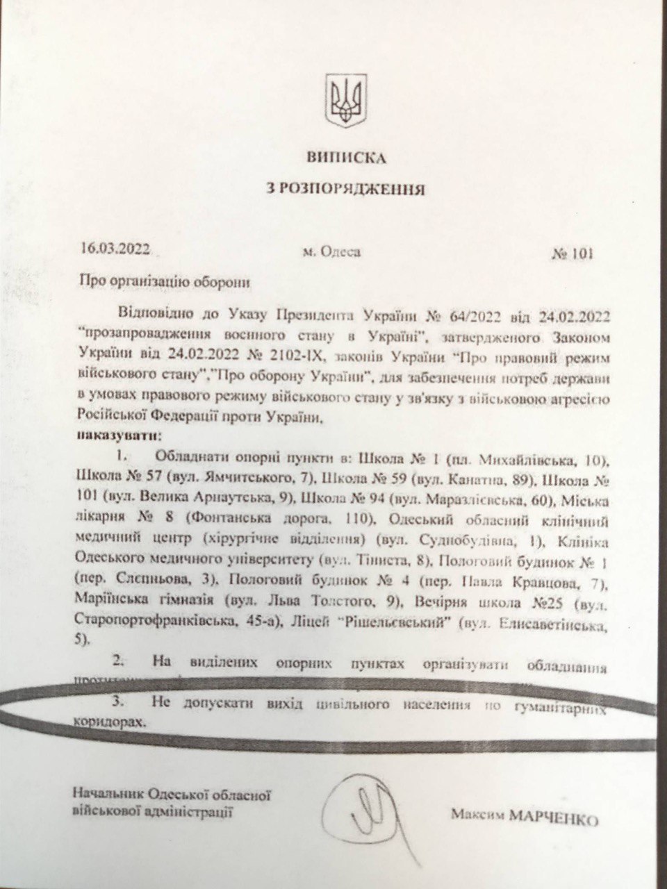 Документ, о котором идёт речь, издан в Одессе. Это выписка из распоряжения об организации обороны города от 16 марта 2022 года за номером 101. Согласно документу, опорные пункты обороны должны располагаться в школах, больницах и родильных домах. И главное, о чём гласит документ: "Выход гражданских по гуманитарным коридорам запрещён". Подписан документ начальником Одесской областной военной администрации Максимом Марченко. Язык оригинала украинский.