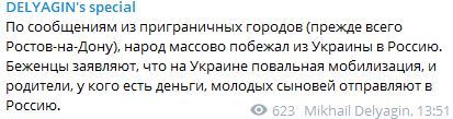 По сообщениям из приграничных городов, народ массово побежал из Украины в Россию. Беженцы заявляют, что на Украине повальная мобилизация, и родители, у кого есть деньги, молодых сыновей отправляют в Россию, - пишет Делягин в Telegram.
