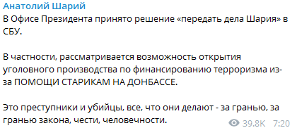 "В частности, рассматривается возможность открытия уголовного производства по финансированию терроризма из-за помощи старикам на Донбассе", - написал журналист в своём Telegram-канале.