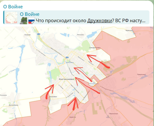 Российские войска смогли закрепиться в зданиях по улице Цинковой и продвинуться к улице Мусоргского и улице Кутузова почти в центре Константиновки. Несколько восточнее бойцы армии России подошли к окраине промзоны по реке Кривой Торец, взяв первые ангары в южной её части. Если удастся занять ее полностью, то это даст ВС России опору для продвижения дальше — на северо-запад — к западным окраинам Константиновки,